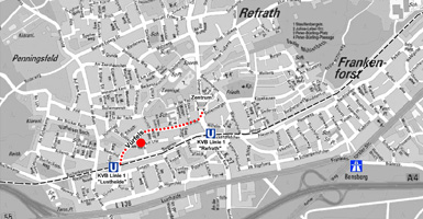 BAB 4: Von Osten aus Richtung Olpe bzw. von Westen aus der City nehmen Sie die Ausfahrt 18 Refrath/Bensberg. Hier links auf die Olpener Straße (B55) in Richtung Refrath/Bensberg fahren. Nach ca. 300 m biegt man links ab auf die Straße In der Auen. Die zweite Straße rechts ist der Vürfels. Hier liegt das Büro nach ca. 600 m auf der rechten Seite. Parkmöglichkeiten finden Sie im Straßenraum. ÖPNV: KVB Linie 1 Haltestelle Lustheide. Man geht auf dem Vürfels in Richtung Norden, das Büro befindet sich nach ca. 300 m auf der rechten Seite. |